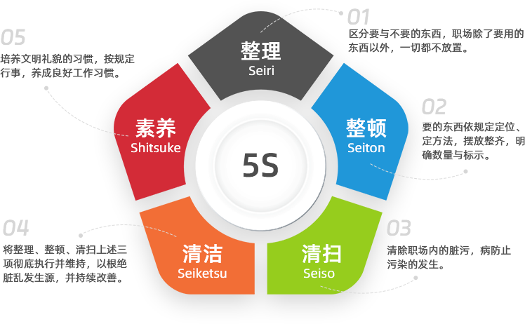 5S起源于日本,其包括“整理(Seiri)、整顿(Seiton)、清扫(Seiso)、清洁(Seiketsu)、素养(Shitsuke)。”五项要素,因其首字母均为“S”故简称5S。5S与目视化管理是精益改善的基础,是一切管理活动的基础。